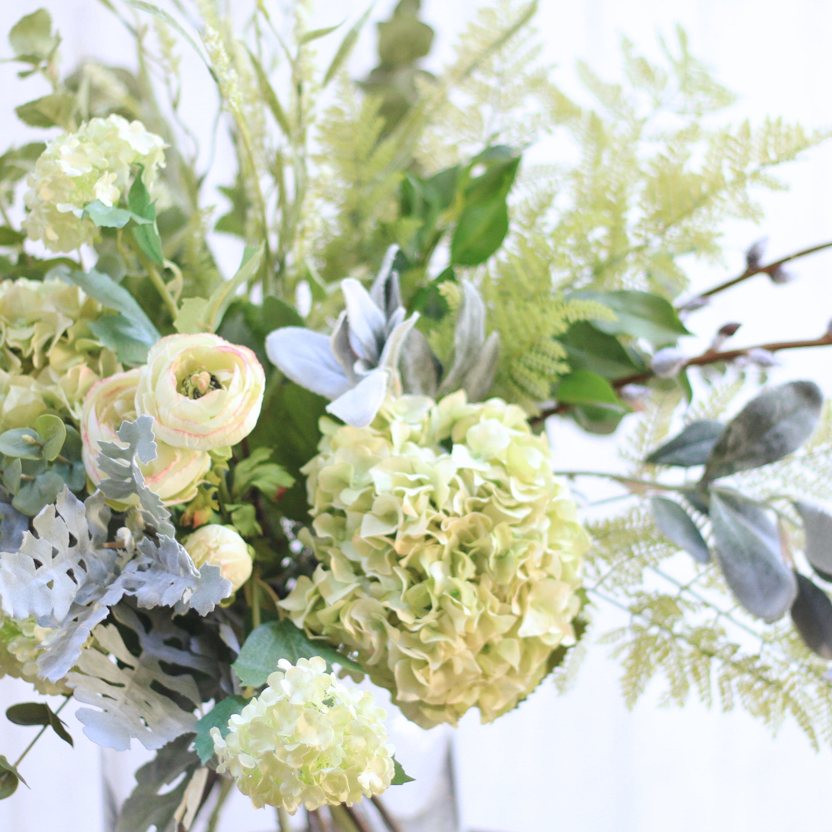 Why we love it - The gorgeous gathered look of this artificial flowers bouquet is a wonderful way to bring the outdoors in and add a natural feel to your home. The wild grass, willow stems, eucalyptus and fern spray look as though they have been freshly picked from a meadow and are complemented by the texture of our dried green hydrangea and ranunculus spray. This gorgeous neutral bouquet is incredibly versatile and will suit a variety of interiors